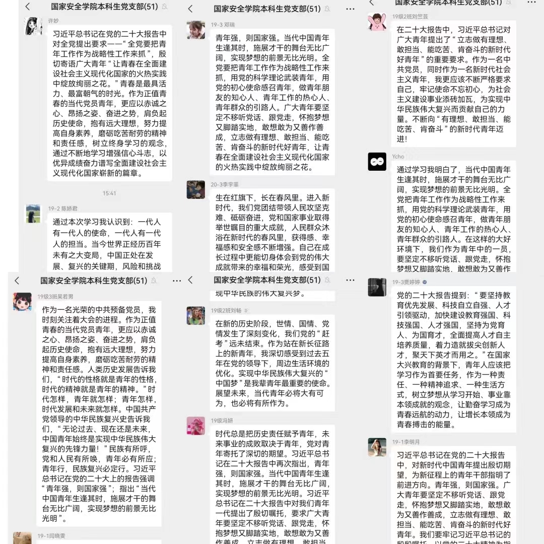 会议最后,全体党员一同观看了习近平总书记在党的二十大中对青年寄语的相关视频,进一步明确了当代青年的使命和任务,习近平总书记在报告中对新时代广大青年赋予殷切期待,给广大青年在奋斗的道路上打了一针强心剂。本科生党支部党员感悟到作为青年应以党的二十大精神为指引,用坚定的理想信念照亮人生道理,用伟大的中国梦激扬青春梦想,努力争做新时代模范青年。
