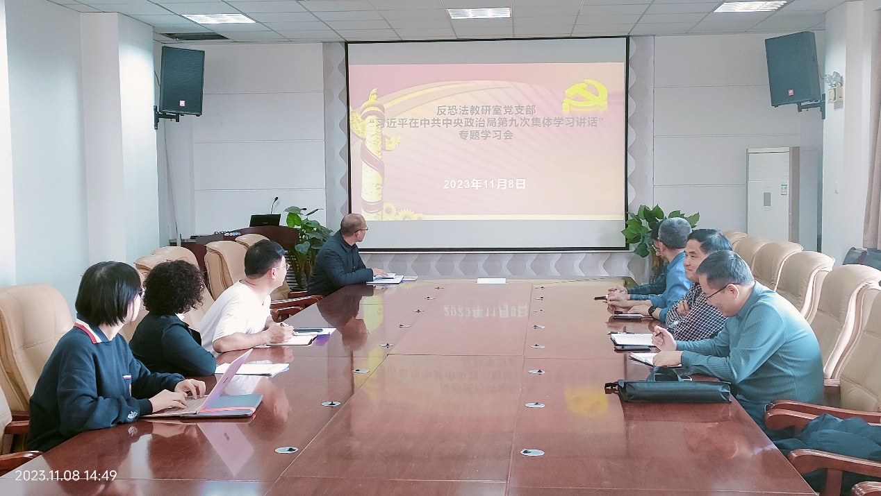 11月8日下午,十大博彩平台 反恐怖主义法教研室党支部在十大博彩平台 会议室召开支部政治理论学习会议,集中学习习近平总书记在中共中央政治局第九次集体学习时的重要讲话精神,支部全体党员参加。会议由支部书记张波主持。