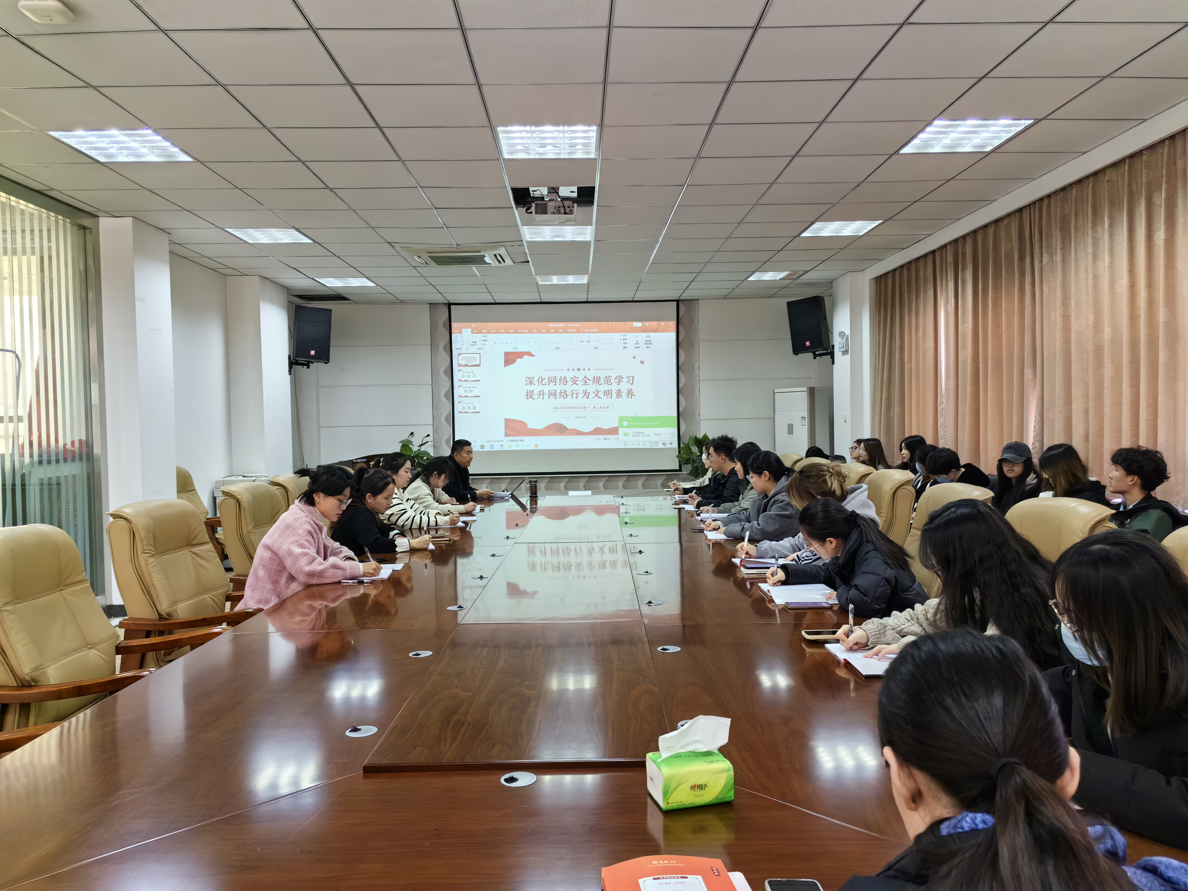 会上,李政敏以“深化网络安全规范学习 提升网络行为文明素养”为题,从深化网络安全规范学习的重要意义、网络安全规范学习的核心内容和提升网络行为文明素养的途径等三个方面进行深入浅出的讲解。他结合《中国共产党纪律处分条例》等党内法规和法律制度,带领同学们深入了解学习网络安全规范的精神实质,并要求同学们提高政治站位,从维护国家安全高度认识遵守网络安全行为规范的重要性;严于律己,以遵守国家法律和党内法规为底线,践行网络安全行为规范;牢记使命,发挥党员先锋模范作用,积极做好网络安全行为规范宣讲。