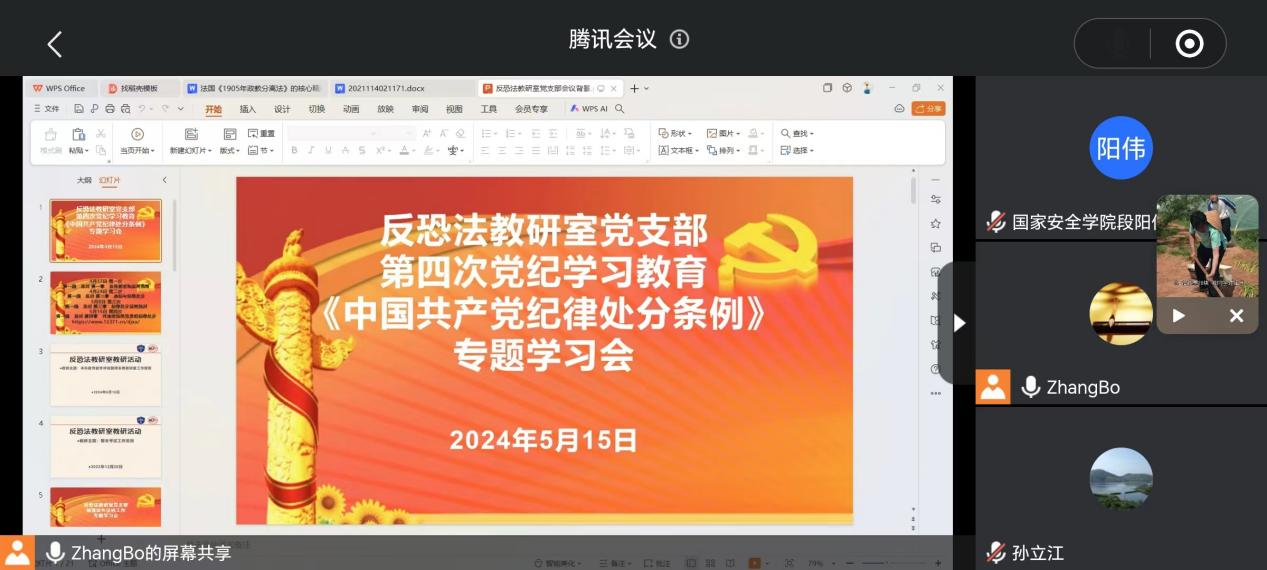5月15日,反恐法教研室党支部召开党纪学习教育。会议由支部书记张波主持,支部全体党员参加会议。
