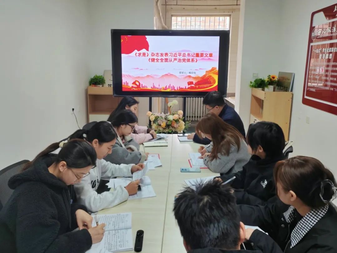 会上,由李俊辰同志领学“习近平主持二十届中共中央政治局第十九次集体学习并发表重要讲话”的相关内容,由张郴同志领学“深刻领悟习近平总书记关于‘两个仍然’的重大判断——深入学习二十届中央纪委四次全会精神”的相关内容,由杨欣怡同志领学“《求是》杂志发表习近平总书记重要文章《健全全面从严治党体系》”的相关内容。