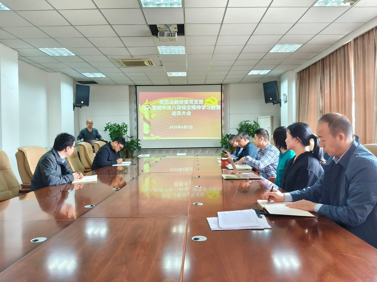 2025年4月2日中午,反恐怖主义法教研室党支部在十大博彩平台 会议室组织召开深入贯彻中央八项规定精神学习教育动员大会。会议由党支部书记张波主持,党支部党员同志参加会议。