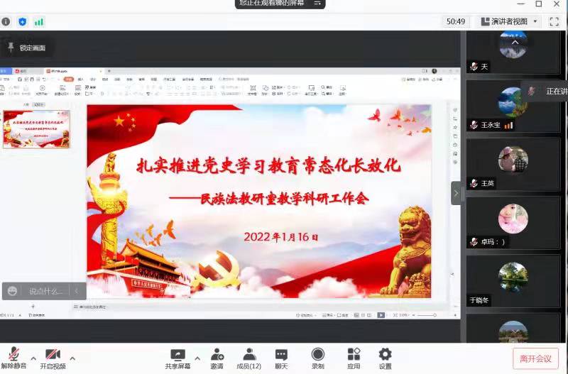 线上教学工作做了汇报,对于进一步加强课程思政教学,结合一线教学实践做好《中华民族共同体概论》线上线下相结合教改工作进行了安排部署。要求支部全体教师切实做好放假前的各项工作,落实导师制职责,不断加强与学生的联系,对学生进行生活、学业指导,确保假期线上教学辅导不断线。
