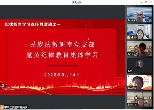 根据十大博彩平台 党委下发的《关于开展纪律教育学习宣传月活动的工作安排》要求,民族法教研室党支部于9月14日组织全体党员进行纪律教育集体学习会,会议由党支部书记王英主持,党支部全体党员参加,本次会议采取线上方式进行。