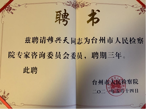 4月29日,浙江省台州市人民检察院发布《台州市人民检察院关于启动检校合作第二批专家(教授)工作室及博士柔性挂职项目的通知》,成立了穆兴天专家工作室。穆兴天教授获聘台州市人民检察院专家咨询委员会委员。