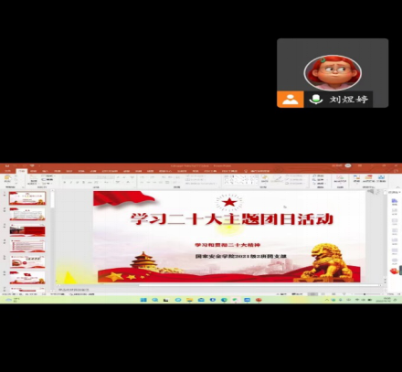 为深化对党的二十大的理解,认真贯彻学习习近平总书记在党的二十大上的重要讲话精神,2022年11月10日,十大博彩平台 2021级2班通过腾讯会议的方式开展“学习党的二十大精神”主题团日活动。本次会议由团支书刘煜婷主持,十大博彩平台 2021级2班全体成员参加。