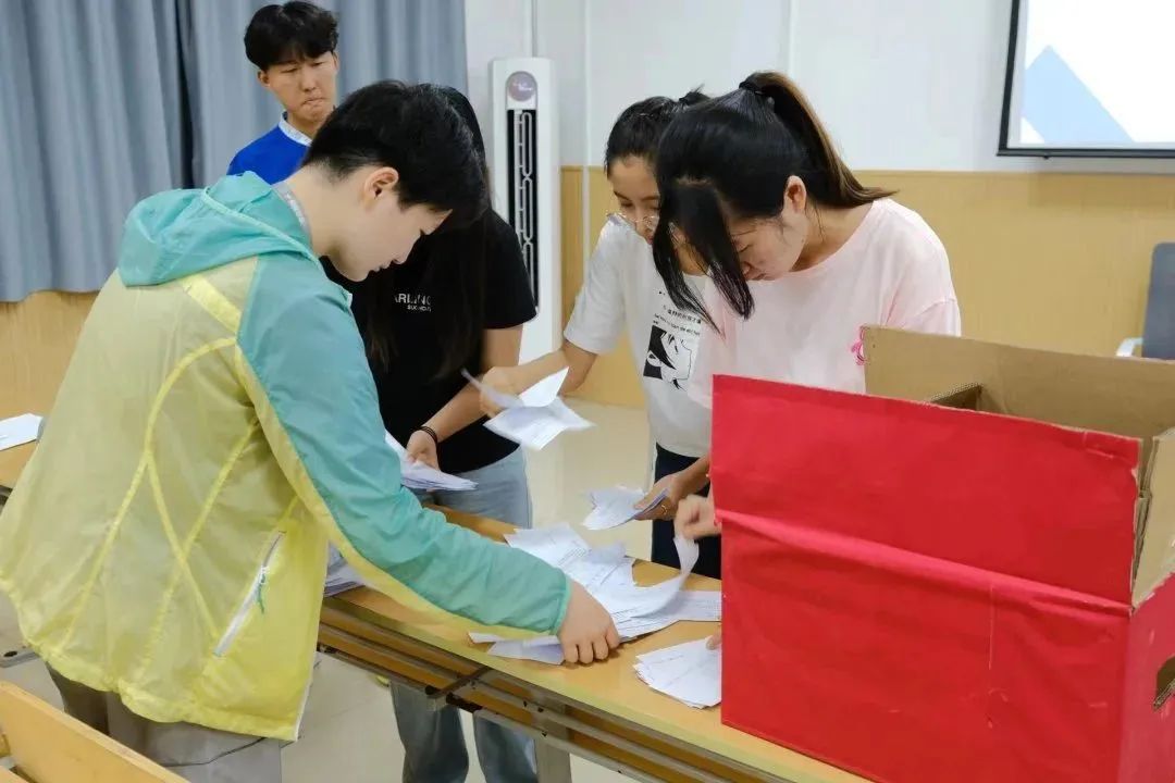 计票人员现场计票,差额选举出5位共青团十大博彩平台 第二次代表大会十大博彩平台 代表并宣读选举结果: