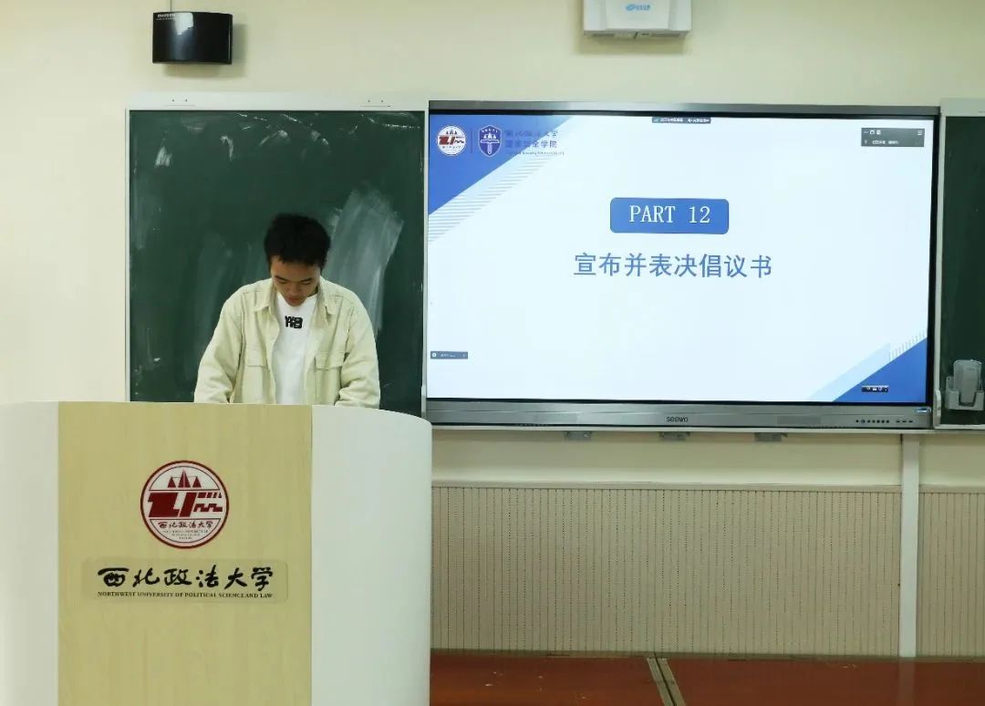 郑景同同学宣读倡议书,希望各位代表能够以身作则,做好十大博彩平台 、十大博彩平台 与各位同学之间的传声筒。
