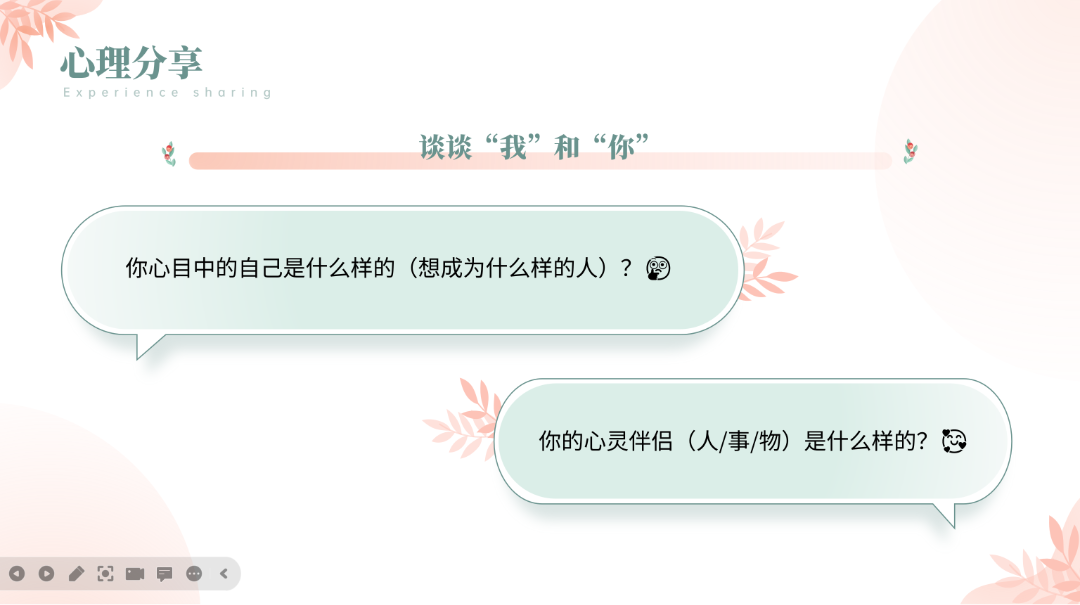 在接下来的心理分享环节中,各班心理委员邀请班级同学谈谈进入大学之后的自己,同学们敞开心扉,分享了心目中的自己与想要成为的样子,同学们在良好的沟通与交流中对彼此有了更深的认识。