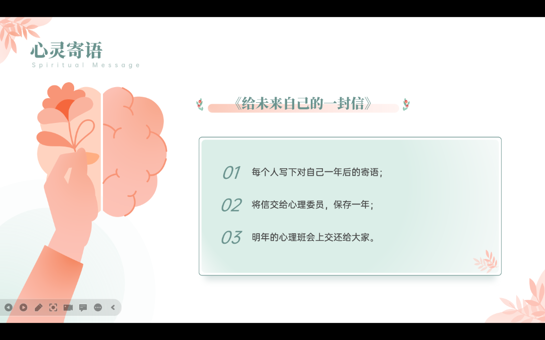 在心灵寄语环节中,由各班心理委员向全体同学重新发放纸条,邀请同学们写下《给未来自己的一封信》,作为对自己未来一年后的寄语,同学们拿起纸笔,认真写下了对自己未来想说的话,或是一句勉励,或是一句期待,无论何者,都抒发了同学们肺腑之言。随后,由各班心理委员将信纸收集,明年此时返还同学,以此见证自己进步成长的一年。