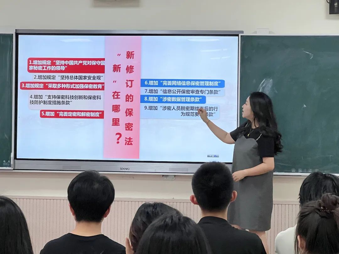 张婕妮老师从保密工作的重要性入手,带领同学们深入学习新修订的《中华人民共和国保守国家秘密法》,详细阐述了其修订的背景意义、核心条款以及在新时代背景下的保密要求。同时,张婕妮老师结合实际案例,提示同学们应当增强保密意识,明确保密职责。