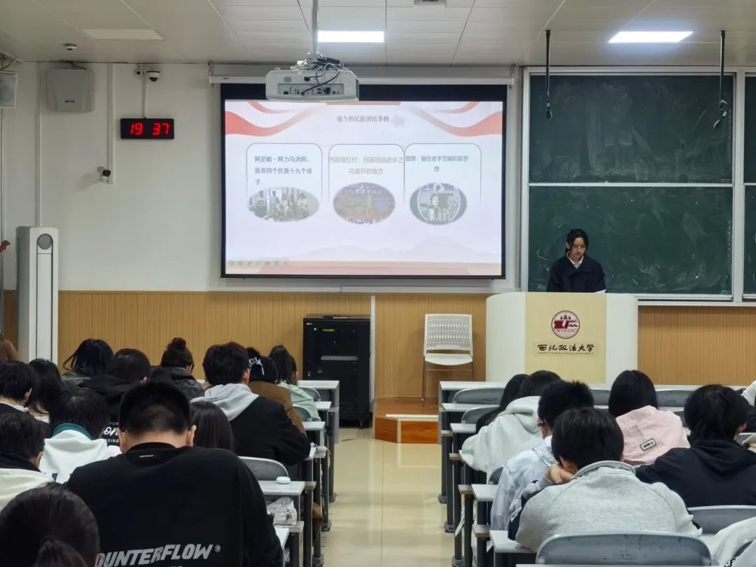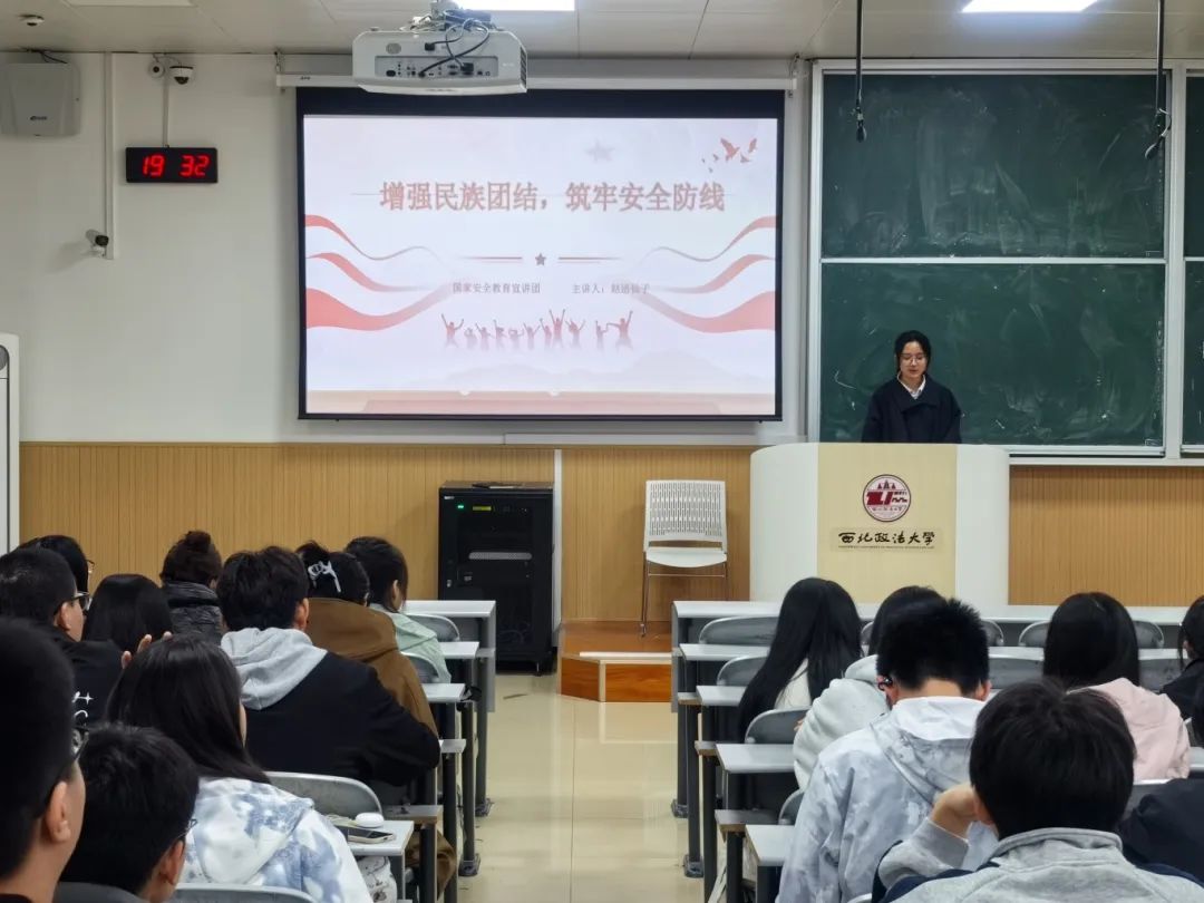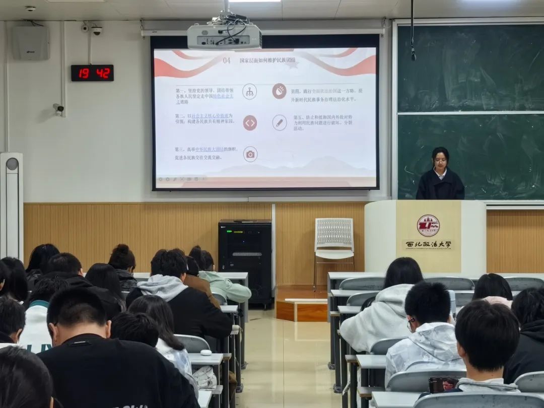 宣讲员赵语仙子从增强民族团结对国家安全的重要性、历史中的民族团结的故事、民族团结面临的潜在威胁、国家层面如何维护民族团结、大学生应该如何维护民族团结五个方面展开,采用文字与实际图片相结合的方式生动讲解,为同学们介绍了民族团结对国家安全的重要性。她还详细讲述了古今有关民族团结的事例,更加说明了当代民族团结工作的必要性与重要性。