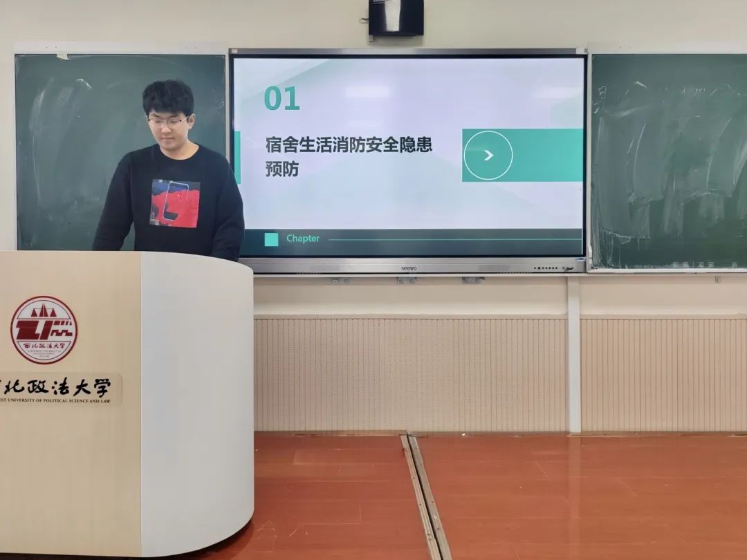 张云哲分别从安全隐患的类型、普及预防措施、重视用电安全和传授火灾逃生方法四方面展开介绍,并结合实际案例,强调宿舍消防安全的重要性。