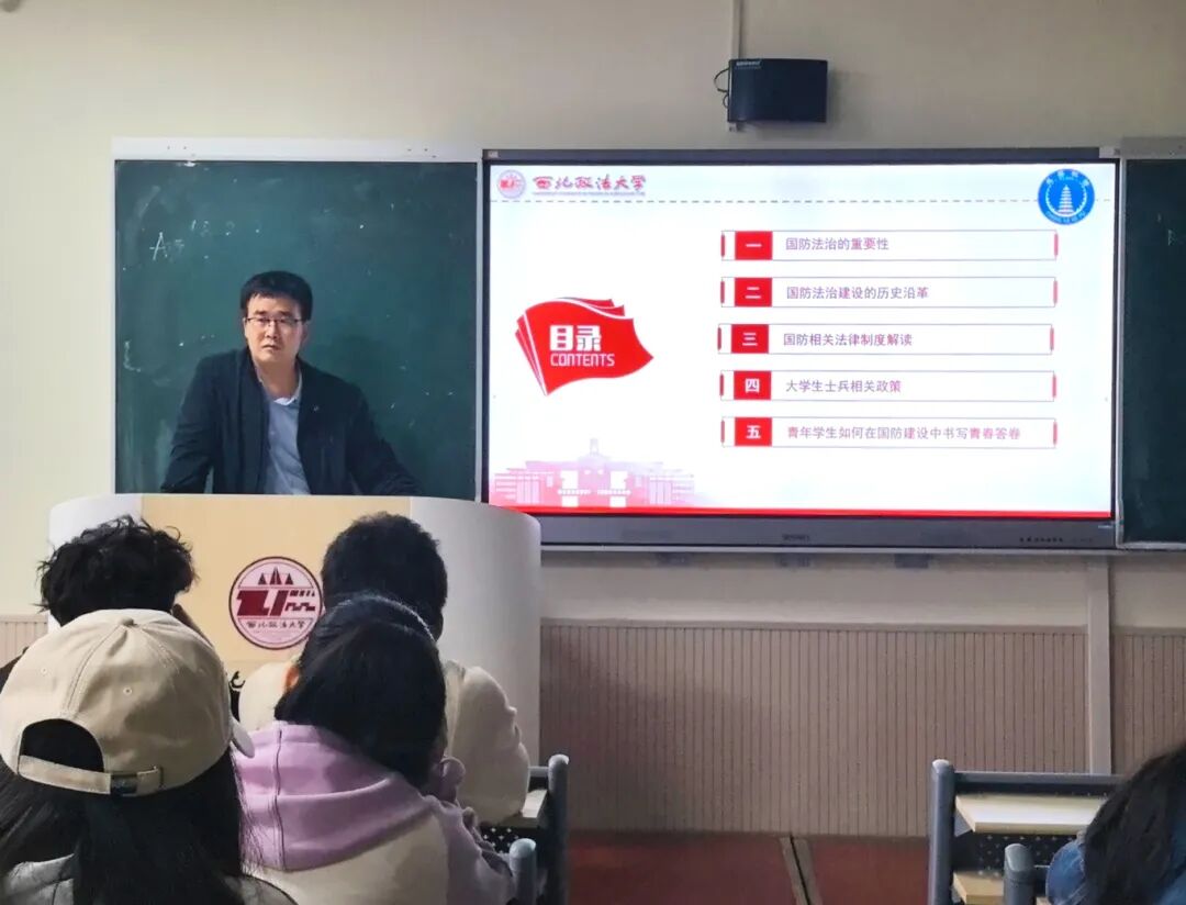 刘卫波从国防法治的重要性、国防法治建设的历史沿革、国防相关法律制度解读、大学生士兵相关政策、青年学生如何在国防建设中书写青春答卷五个方面深入浅出地阐述了国防法治建设路径,系统解读了《国防法》《兵役法》等与青年学生息息相关的法律法规,明确了当代大学生依法服兵役、支持国防建设的责任与义务。同时,他结合当前时政形势,通过生动的案例,让同学们深入了解国防法治建设。