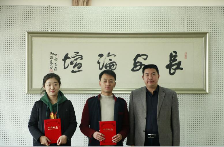 党委副书记刘妍良宣读表彰决定和获奖名单,并对获奖同学进行了赞扬和鼓励。宋白、李政敏、刘妍良、席捷分别为获奖同学颁发荣誉证书并合影留念。