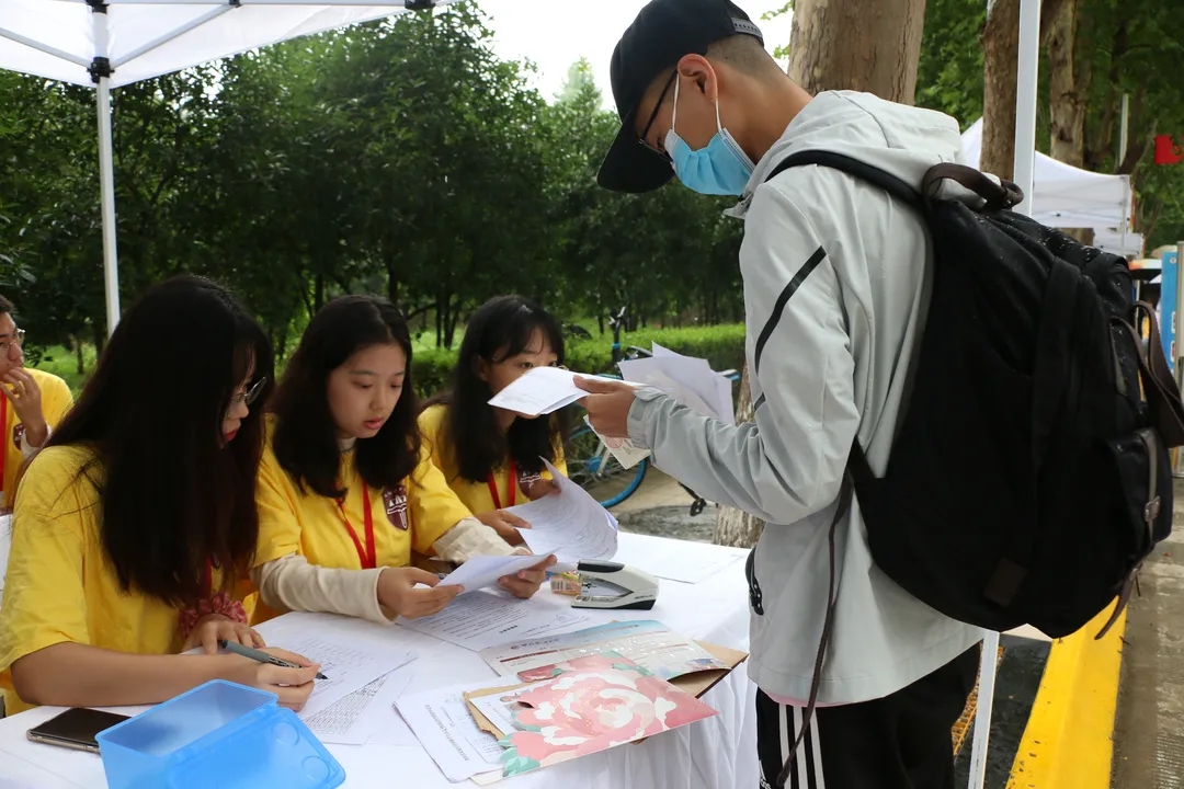 摊位进行开学报道。在摊位值班的学长学姐们为新生们发放校园卡等物品,严格审核新生们的返校申请,提醒新生们严格遵守校园防疫措施;负责后勤保障的学长学姐们悉心为新生们指引宿舍、体检场地等方向,并为他们答疑解惑,介绍校园的各处设施,让新生们更加了解校园。