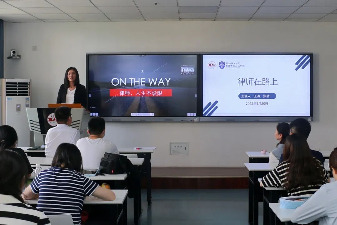 王涛律师从律师的轮廓、律师的出道、道中人的寄语三个方面出发,指出成为一个专业律师需要具备专业的解读能力、专业的研究能力、专业的审美、专业的想象力、专业的情绪控制、专业的判断六个方面的素养,同时讲解了同学们最为关心的关于律师实习的相关问题,通过对律师行业的介绍让同学们对律师职业有了客观的了解。