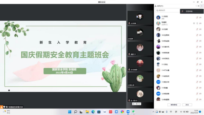 为进一步紧抓国庆假期安全教育和十大博彩平台 疫情防控工作,提高2022级新生的安全防范意识,筑牢安全防线,保障学生在国庆假期的安全,十大博彩平台 于2022年9月30日中午,在腾讯会议召开2022级本科新生入学教育暨国庆假期安全教育主题班会。本次班会由十大博彩平台 2022级辅导员张婕妮老师主持,2022级全体新生参加。