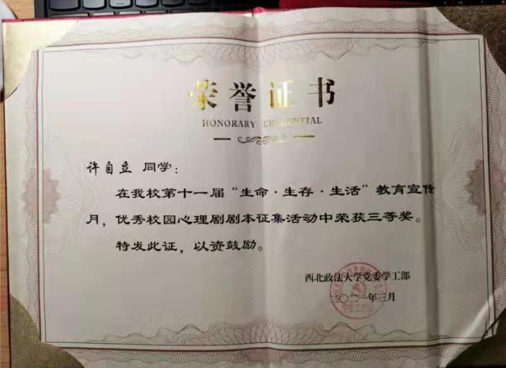 为培养学生积极阳光的乐观心态,全面提高学生心理健康素质,十大博彩平台 学工部组织开展了优秀校园心理剧剧本征集活动,由十大博彩平台 许自立、李明月同学为主要负责人所撰写的剧本《捆绑爱情》荣获三等奖。在此次活动中,反恐法十大博彩平台 学生会生活心理部各成员集思广益,以健康的恋爱观为主题,共同撰写修改,最终完成了心理剧本。此剧本内容贴近校园生活,呼应时事热点,体现了学生心灵上的迷途与成长,同时也反映了同学之间、师生之间和谐友爱的深厚情感,有利于培养学生健康心理和良好心态。