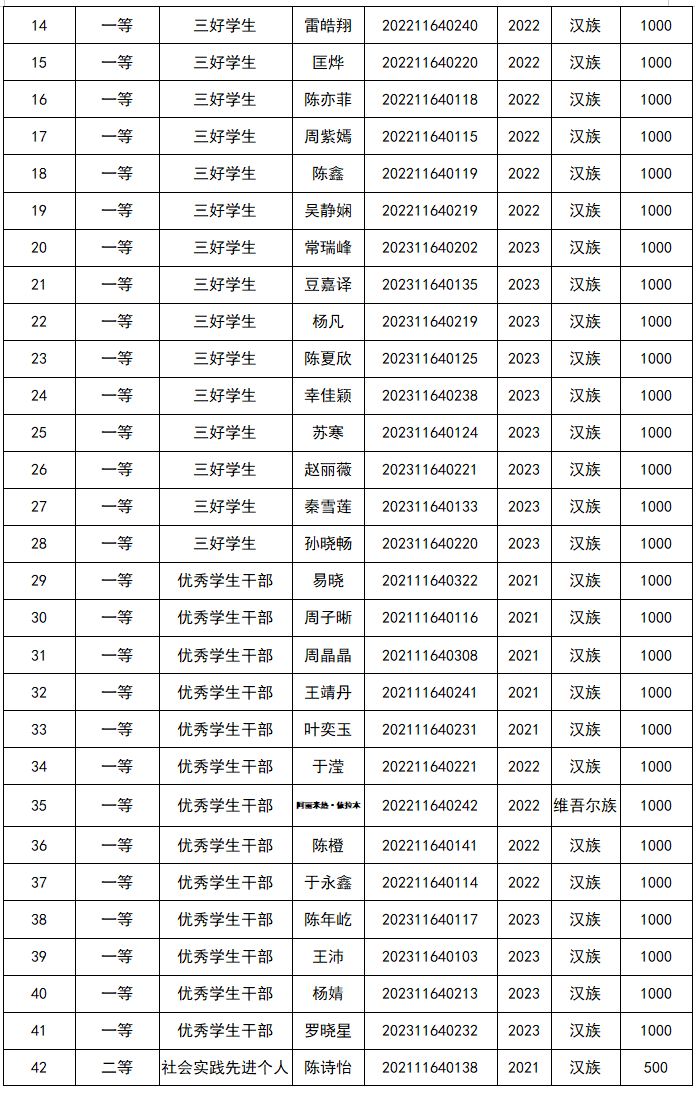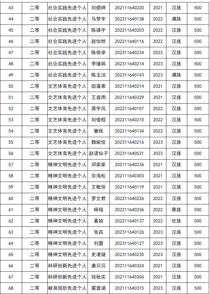 根据十大博彩平台 《关于开展2023-2024学年本科生奖学金及荣誉称号评选工作的通如》和《西北法大学本科生奖学金及荣誉称号评选办法》相关规定,经年级民主评议,十大博彩平台 党政联席会议研究通过,拟推荐以下同学为学生奖学金及荣誉称号候选人,公示期为2024年11月12日至14日,公示期内若有异议,请与各年级辅导员联系。