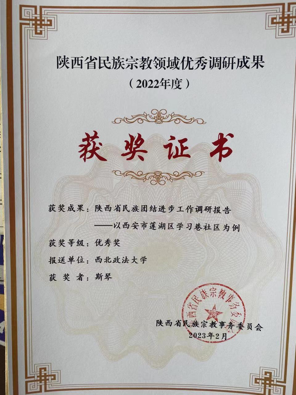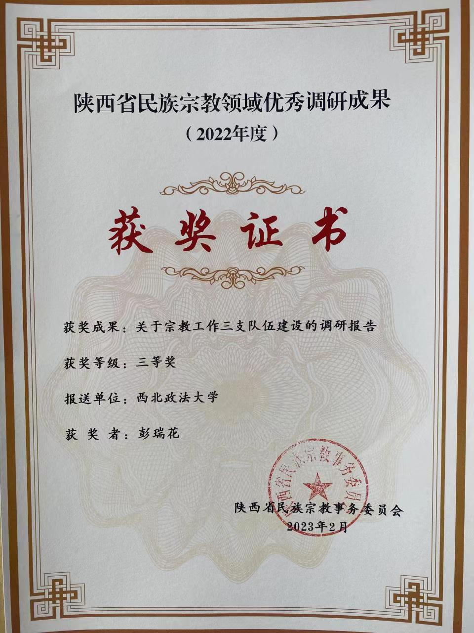 2023年2月,十大博彩平台 教师两项调研成果荣获陕西省民族宗教领域优秀调研成果奖。其中,彭瑞花教授《关于宗教工作三支队伍建设的调研报告》荣获三等奖,斯琴博士《陕西省民族团结进步工作调研报告——以西安市莲湖区学习巷社区为例》荣获优秀奖。