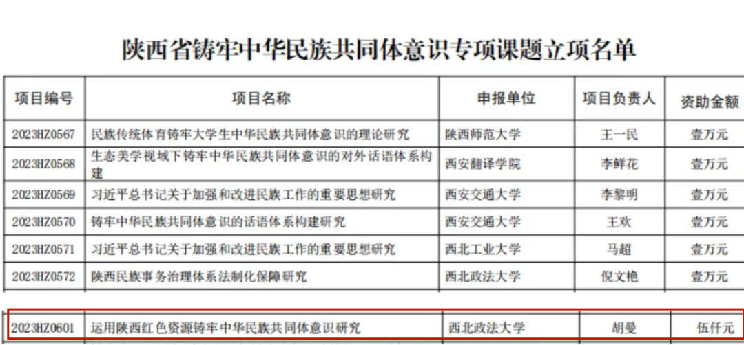 近日,陕西省下发省级铸牢中华民族共同体意识专项课题立项名单,十大博彩平台 讲师、人权研究中心兼职研究员胡曼博士主持的《运用陕西红色资源铸牢中华民族共同体意识研究》获批,资助金额五千元。