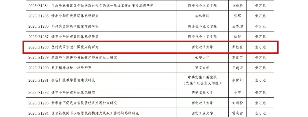 6月25日,陕西省社会科学界联合办公室下达了2023 年度统战理论与实践研究项目立项结果的通知。十大博彩平台 共获得立项资助2项,其中十大博彩平台 院乔巴生老师申报的《坚持我国宗教中国化方向研究》获批2023 年度陕西省统战理论与实践研究项目立项,立项经费1万元。