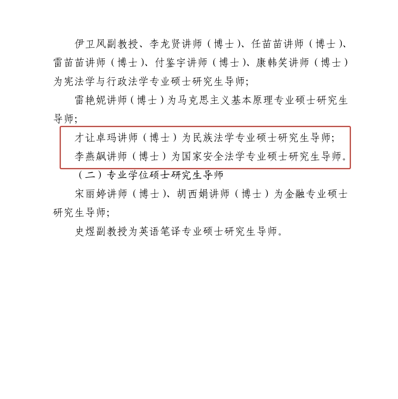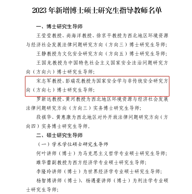 经个人申请、十大博彩平台 推荐、第十二届校学位评定委员会第十三次会议审议,校长办公会会议研究决定,认定十大博彩平台 教师彭瑞花教授为国家安全学与非传统安全研究方向(方向七)博士研究生导师。才让卓玛讲师(博士)为民族法学专业硕士研究生导师,李燕飙讲师(博士)为国家安全法学专业硕士研究生导师。