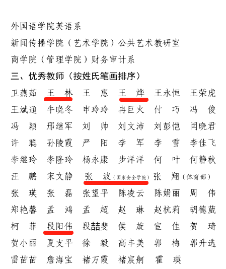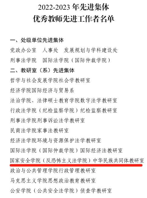 中华民族共同体教研室荣获“教研室(系)先进集体”称号,王林副教授、王烨博士、张波副教授、段阳伟副教授四位老师荣获“优秀教师”称号。