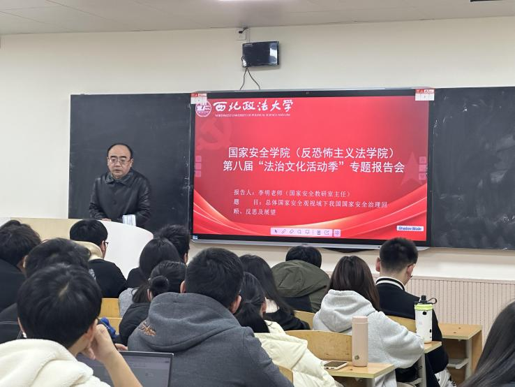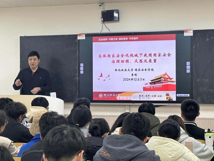 为全面贯彻落实党的二十届三中全会精神,推进习近平法治思想“三进”取得更好效果,强化实践教学和思政育人工作,弘扬法治文化,切实提高学生的法治意识和法治素养,12月3日,十大博彩平台 在长安校区B412教室面向十大博彩平台 2023级本科生,举行了“总体国家安全观视域下我国国家安全治理回顾、反思及展望”专题报告会。报告会由副院长宋海彬主持,国家安全教研室主任李明老师主讲,辅导员张婕妮和教务秘书秦哲参会。