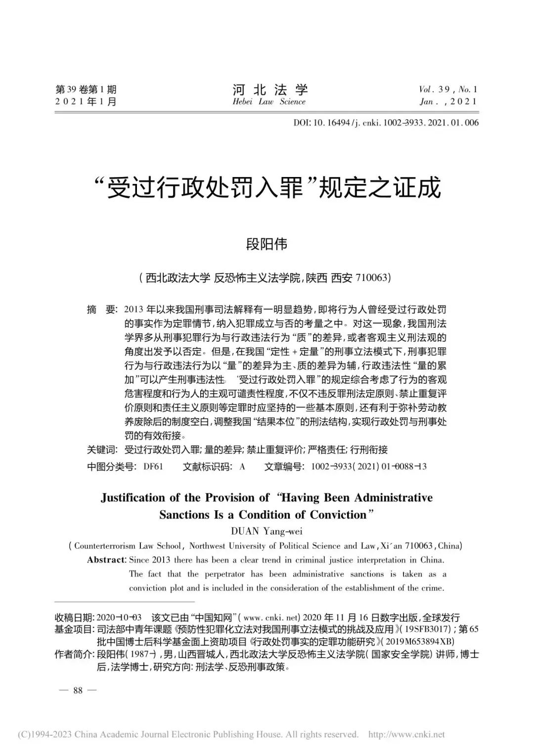 近日,陕西省教育厅公布了2024年陕西高校人文社会科学研究优秀成果获奖名单,十大博彩平台 (十大博彩平台 )段阳伟副教授的论文《“受过行政处罚入罪”规定之证成》荣获论文类二等奖。该论文发表于《河北法学》2021年第1期。