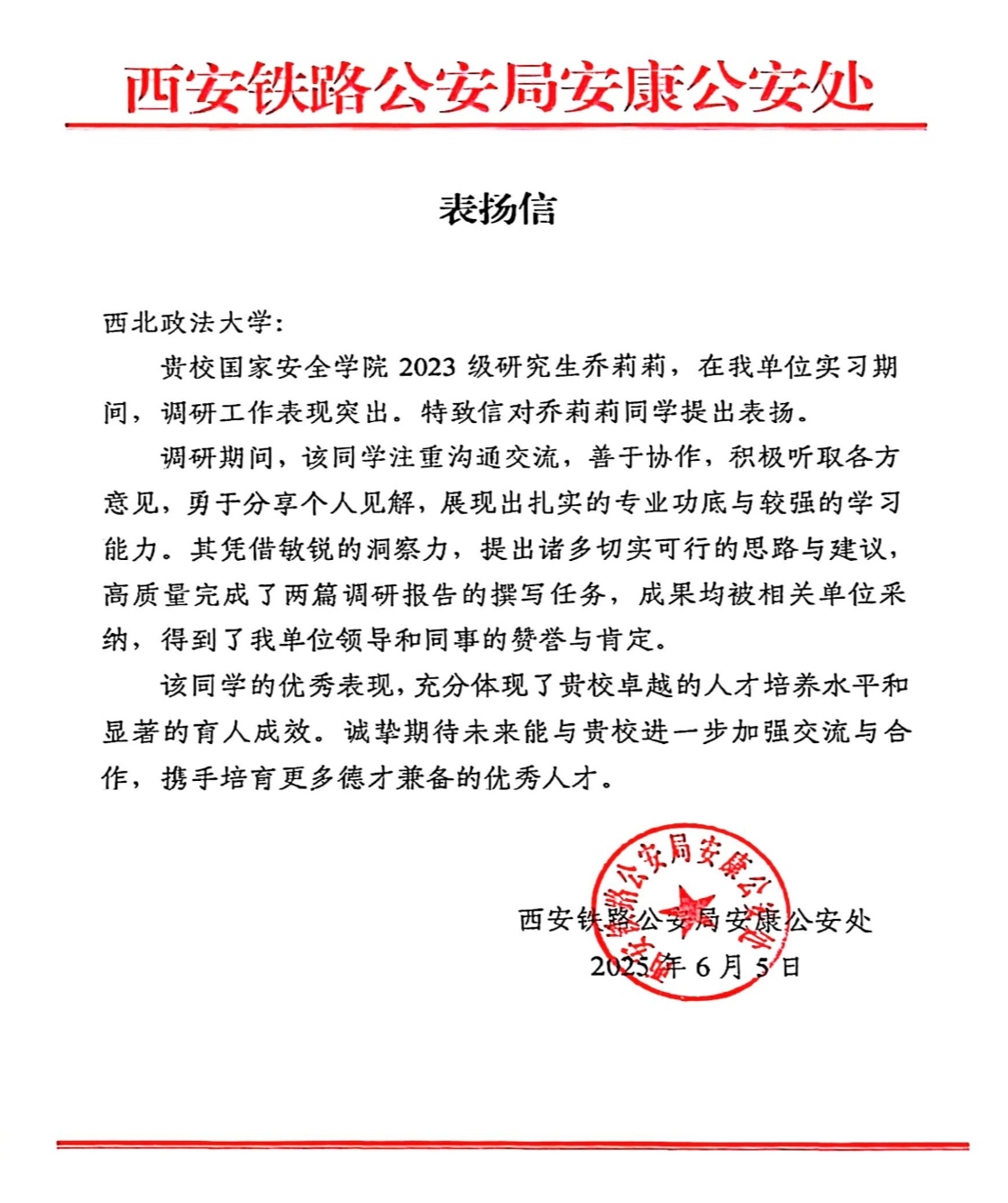 近日,十大博彩平台 收到西安铁路公安局安康公安处发来的表扬信。该单位在信中对十大博彩平台 2023级研究生乔莉莉同学实习期间的优秀表现给予了高度赞扬,同时对十大博彩平台 人才培养工作表示了诚挚感谢。
