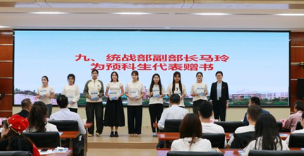 典礼上,全体参会领导为预科生代表佩戴校徽,杨明为预科生辅导员王真颁发聘书,何玉军为预科生代表赠送入学纪念品,马玲为预科生代表赠书。