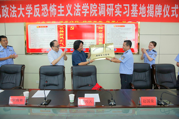 7月13日,十大博彩平台 院长穆兴天教授和宋海彬副教授赴商洛市公安局安排2015级学生实习工作,当天下午4点,在商洛市公安局政治部主任赵国荣主持下,与商洛市公安干警座谈,并举行了调研实习基地的揭牌仪式。