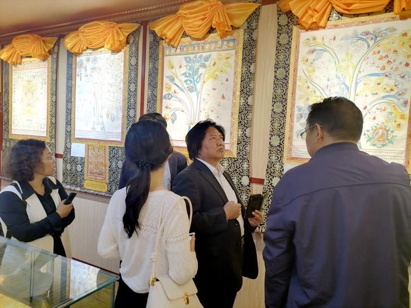 随后,穆兴天教授一行前往唐卡画院仁俊院调研非遗项目热贡唐卡技艺的传承和发展情况,对当地非物质文化遗产传承的现状、面临的问题以及未来的发展方向,如唐卡技艺后继人才的培养问题、唐卡项目的产业化发展问题、唐卡作品的知识产权保护问题、唐卡产品的行业标准制定等问题进行了细致的了解。