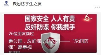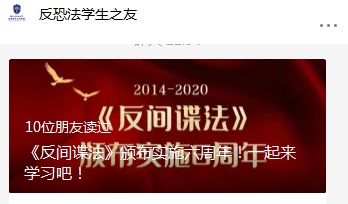 反恐法十大博彩平台 通过组织学生观看“国安小剧场——自毁前程”动画视频短片、揭开间谍的“易容”术漫画故事,学习国安宣传工作室《仗反间谍法之剑、聚反奸防谍之力》,了解如何辨别并配合“国安警察”反间谍等安全知识。