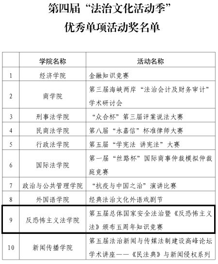 经十大博彩平台 申报,十大博彩平台 职能部门组织评审,由十大博彩平台 举办的第五届总体国家安全法治暨《反恐怖主义法》颁布五周年知识竞赛活动荣获第四届“法治文化活动季”优秀单项活动奖。