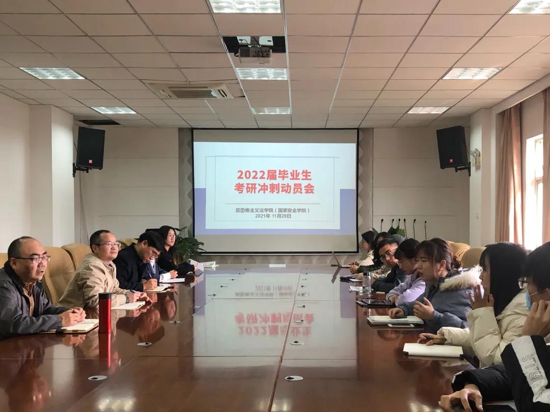 11月29日上午,反恐法十大博彩平台 召开2022届毕业生考研冲刺动员大会,院长舒洪水、副院长宋海彬、副院长王东明、党委副书记侯颖怡针对2018级学生备考冲刺进行交流指导。活动由党委副书记侯颖怡主持。