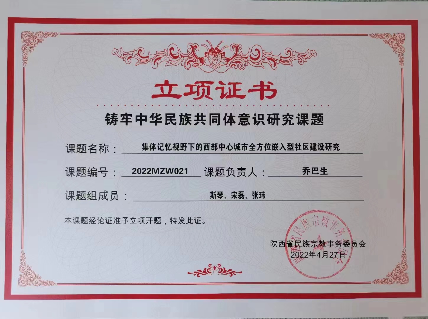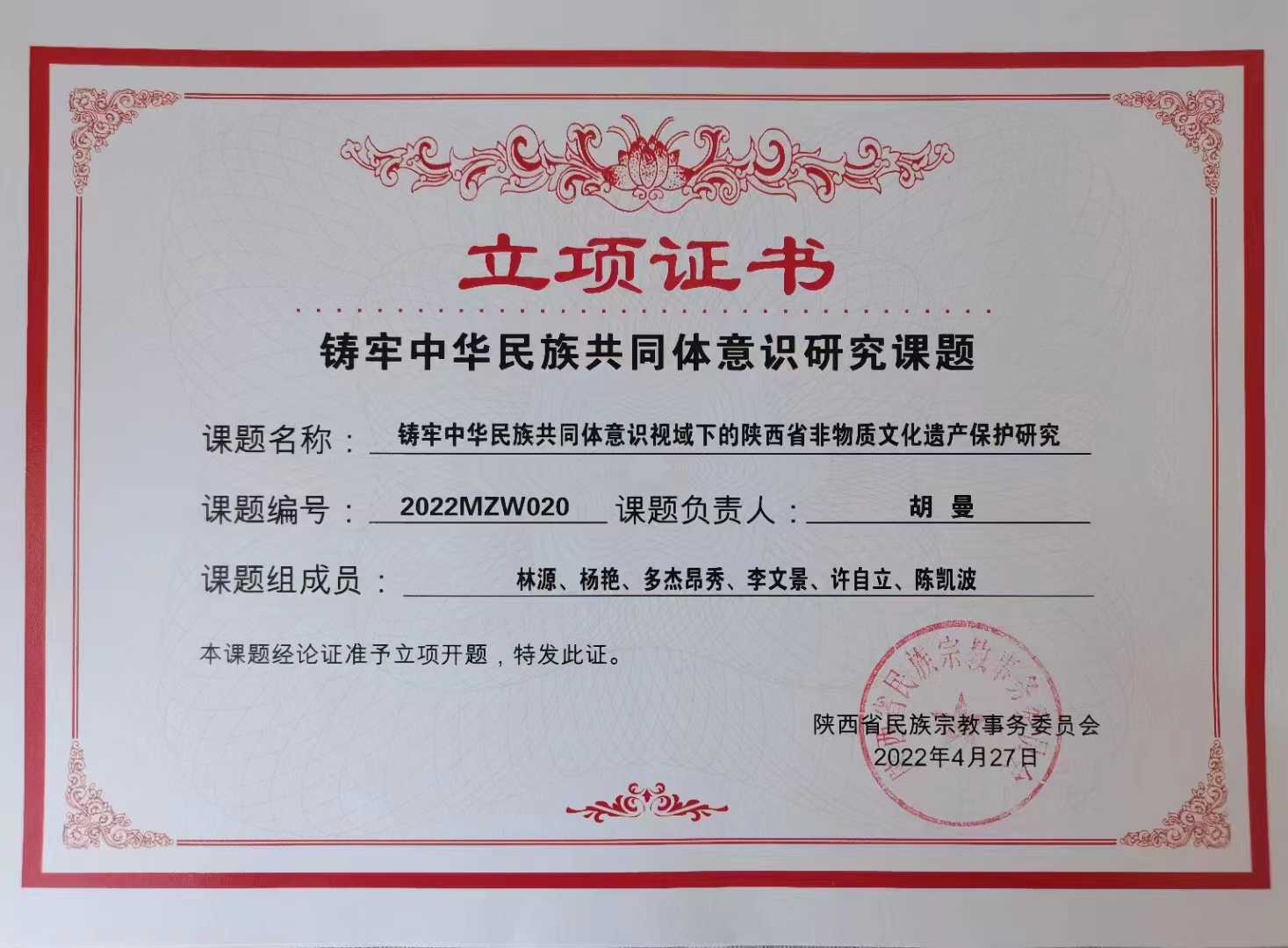 近日,反恐法十大博彩平台 胡曼博士、乔巴生博士主持的课题“铸牢中华民族共同体意识领域下的陕西省非物质文化遗产保护研究”、“集体记忆视野下的西部中心城市全方位嵌入型社区建设研究”获批立项。