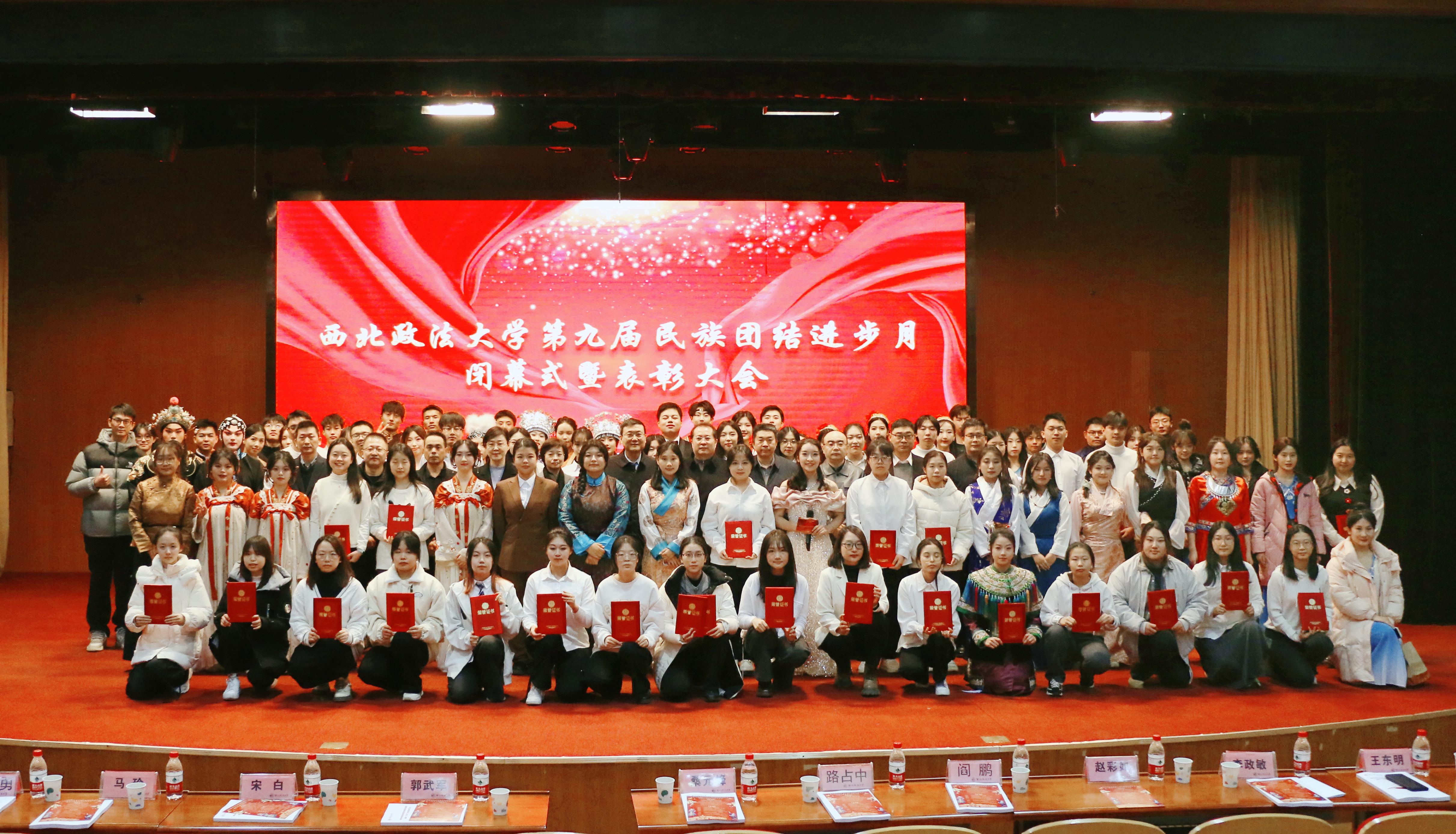 12月17日,由校党委统战部、宣传部、学工部(学生处)、研工部、校团委、研究生院和十大博彩平台 共同举办的第九届民族团结进步月闭幕式暨表彰大会在长安校区满天星报告厅举行。校党委副书记郭武军,校党委委员、统战部部长桑元峰,校党委委员、研工部部长宋白,相关职能部门负责人,各十大博彩平台 党委副书记、团委书记,十大博彩平台 弘志奖学金设立者代表及师生代表300余人参加。 大会分别对“中华风韵”手工作品制作大赛、“56个民族,56朵花”海报作品制作大赛、“石榴发声·宣讲家”微视频、“铸牢中华民族共同体意识法治保障”征文比赛和《中华民族共同体概论》书评比赛、“铸牢中华民族共同体意识调研宣讲边疆行”暑期“三下乡”社会实践活动、“十大博彩平台 弘志奖学金”获奖师生进行表彰并颁奖。文艺展演阶段,民族舞蹈《锅庄串烧》《民族舞串烧》、相声《戏剧与方言》、京剧《武家坡》等节目精彩亮相。歌曲《站在草原望北京》传递了草原儿女热爱家乡、心系祖国的爱国情怀,朗诵《生活在英雄们的中间》表达了同学们对革命先辈们的深深怀念,“铸牢中华民族共同体意识微宣讲”让中华民族共同体意识深深植根在同学们的心中,舞蹈《彩袂翩跹:舞动民族团结情》也将活动的气氛推向了高潮。 在第九届民族团结进步月系列活动期间,十大博彩平台 还举办了“铸牢中华民族共同体意识”系列讲座,“增强民族团结 筑牢安全防线”系列宣讲,组织开展“铸牢中华民族共同体意识调研宣讲边疆行”活动,以及“民族团结杯”迎新篮球赛、“同心杯”拔河邀请赛等各类文体活动。系列活动在全校形成了良好的宣传和教育氛围,十大博彩平台 将深入贯彻落实习近平总书记关于加强和改进民族工作的重要思想,扎实有效开展民族团结进步教育活动,将铸牢中华民族共同体意识融入立德树人根本任务,为巩固和发展中华民族大团结作出新的更大贡献。